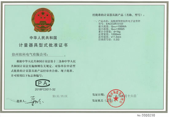 熱烈祝賀徐州依科電氣有限公司專利技術(shù)高精度智控矩陣電子皮帶秤EACCOR-B159獲得0國家0.2級計量證書CPA2018FC0011-32批準證書,配套高精度矩陣傳感器及矩陣智能稱重控制器(采用SEQ-AI智能算法,矩陣控制跟蹤復(fù)核技術(shù),...